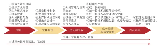 “写我要做、做我所写、记我所做”均围绕基地建设的主要流程及涉及到的主要工作内容展开。整个流程可分为规划、文件编写、选址与准备、生产管理与质量控制、内审与完善5个阶段。每个阶段需要实施的主要工作内容见图2。从规划到内审应进行全过程关键环节记录,保证可追溯;从选址与准备到内审,企业需进行关键环节现场指导、监督,保证主要实施内容得以贯彻。