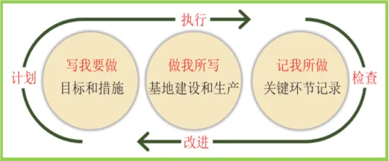 新版中药材GAP基于质量风险管控的理念要求,中药材GAP基地建设的基本思路概括为“写我要做,做我所写,记我所做”(图1)。首先,对需要建设的GAP基地进行整体规划,明确基地建设的目标和措施,制定相应的制度、规程等,并以文件体系的形式明确和固定,即为“写我要做”。企业一定要基于基地建设的实际情况,实事求是确定目标和措施,不能低于新版中药材GAP的要求,也不要制定难以企及的目标、后续无法做到的措施,一旦“写”下了要做内容,后续就一定要实施。企业“写我要做”以后,就应该按所“写”内容,包括目标和措施等,开展基地建设和生产,忠实实施所“写”内容,即“做我所写”。为保证中药材生产、质量控制、质量保证等活动可追溯,企业需记录关键环节的操作和数据,即“写我所做”。概言之,计划过程就是“写我要做”,执行“写”下的内容就是“做我所写”,记录所做过程的关键数据就是“记我所做”,对整个过程进行检查并持续加以改进就是内审过程。