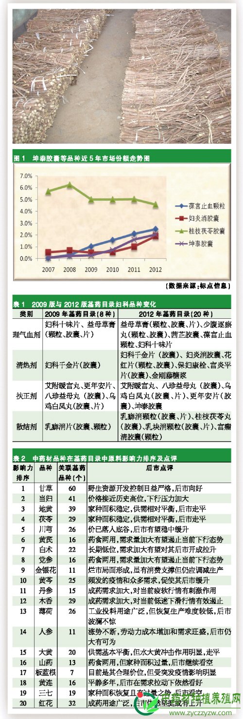 第二层利好来自于全球健康理念的深刻变革。全球心因性疾病、亚健康人群持续增长,提升人群生存质量已成为当下医疗卫生事业的重大使命,大健康时代已经切切实实地到来。医疗保健的目的是让人类远离医院、药物和手术室而非相反,人们不但要生存,还要快乐地生存。本次基药目录中新增多个中成药品种明显顺应了这一时代潮流。以新增品种坤泰胶囊为例,该药是SFDA批准的唯一能改善卵巢功能衰退的专利中成药,组方就源自于张仲景治疗更年期的名方,具有滋阴清热,安神除烦作用,用于绝经期前后诸证。既是药品也可以说它是养生保健品,顺应了大健康产业发展方向。从图1可见,从2009年开始,该品种市场份额连续飞跃上升。可以预见,进入基药目录后,这类品种前景更为广阔,对优质道地中药材原料的需求也更为迫切。