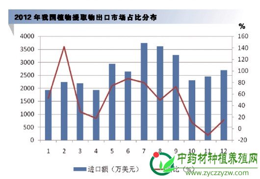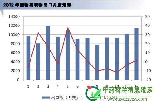 2012年,虽然行业发展遭遇诸多困难,致使出口增速放缓。但是,从中国海关提供的出口数据的月度趋势看,在11月份植物提取物出口已开始回暖,2013年植物提取物出口前景依然看好。