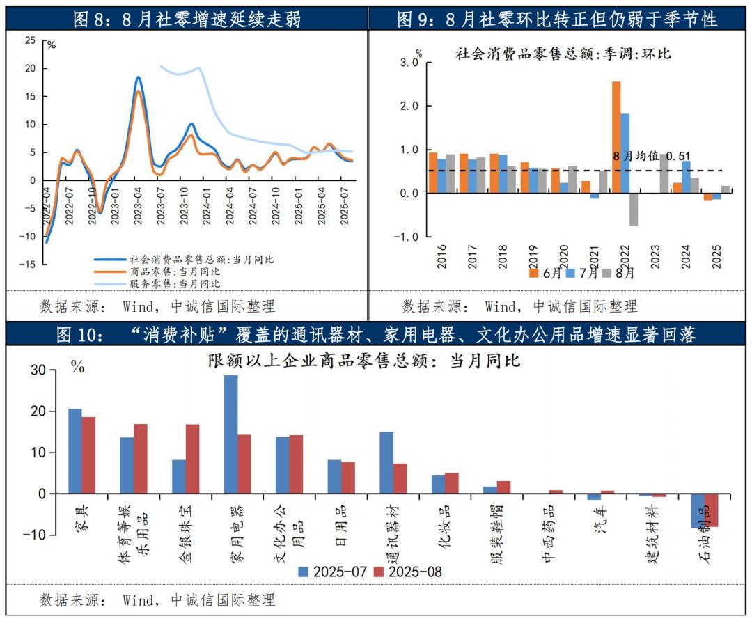 (二)8月社零延续回落,在较高基数、资金退坡和透支效应影响下, “以旧换新”类消费虽维持较高增长但明显走弱,体育娱乐、黄金等升级类消费接续成为主要支撑项。2025年8月社零增速录得3.4%,较上月回落0.3个百分点,环比增速转正(0.17%),但仍低于过去十年的平均环比增速(0.51%)。从消费结构看,8月服务消费仍好于商品消费。商品零售同比增速为3.6%,较上月回落0.4个百分点;服务消费在暑假出行娱乐需求支撑下整体仍维持5.1%的韧性增长。8月第三批以旧换新资金690亿元下达完毕,但金额较前两批各810亿元有所下降,资金退坡的同时,部分家庭家电、汽车类产品的置换需求趋于饱和,叠加去年基数效应,8月部分以旧换新覆盖领域的消费有较为明显的下降。家电、通讯器材的社零增速分别较上月下滑14.4、7.6个百分点至14.3%和7.3%,家具类商品社零增速仍位居行业首位,相对具有韧性,但也较6月高点累计下滑近10个百分点,商品补贴对以旧换新的支撑作用在逐步减弱。相较而言,消费升级类商品增势良好,体育娱乐用品和金银珠宝类消费为8月主要增长项,二者较上月抬升3.2和8.6个百分点,有望成为拉动消费的主要接续力量。
