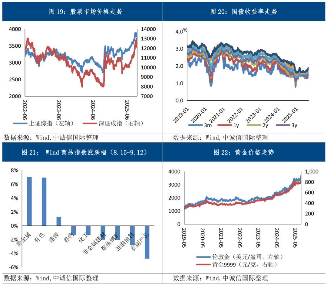 后续来看,近期股票市场波动上涨主要受政策和流动性驱动,A股盈利尚未出现明显改善,考虑到经济修复承压下流动性仍难收紧、增量政策有望进一步出台,预计对股票市场仍有一定支撑;但也需注意,股票市场估值历史分位已相对较高,若无基本面支撑,进一步上涨动力或有所减弱,预计权益整体难以出现8月类似走势,建议关注科技成长板块以及有景气、业绩支撑的细分周期性领域。从债券市场看,近期债市收益率波动上行主要受股债跷跷板效应、基金赎回新规征求意见稿等影响,但权益上涨过快或带来一定回调压力,后续股市对债市的压制或边际弱化,收益率进一步上行空间较为有限;基本面和政策方面,在《二季度货币政策执行报告》“落实落细适度宽松的货币政策”的要求下,短期内调降政策利率概率有所降低,叠加收益率对基本面反应钝化,收益率下行动力也较为不足,短期内预计呈区间波动走势。从大宗商品看,近期OPEC月报表示8月OPEC+原油产量环比增加50.9万桶/日至4240万桶/日,产量增长加快,同时国际能源署和美国能源信息署均上调25年全球供给增速,叠加原油需求依然偏弱,供需失衡局面或难以扭转,原油上涨动力依然不足?;平鸱矫?,美联储降息渐进或仍对黄金价格形成一定支撑,但在降息实际落地后,美债利率或出现反弹,带动黄金阶段性波动;中长期看,全球央行购金趋势持续、美元信用风险仍存等依然支撑黄金配置价值。