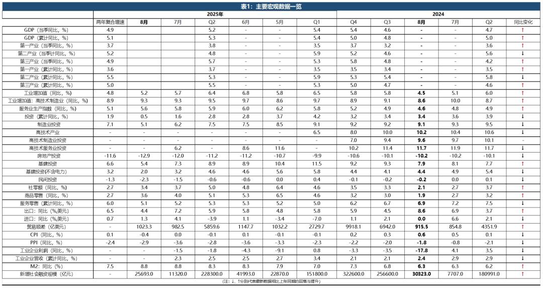 展望后续,外部扰动对宏观经济的影响或逐渐显现,近期中美双方在西班牙首都马德里启动中美第四轮贸易谈判磋商,中美围绕关税、出口管制等方面的贸易制裁仍有较大的不确定性,8月出口对制造业生产、投资的拖累开始显现,9月至今年年底受高基数影响,出口大概率承压,企业用于出口的生产备货仍将偏弱,或成为生产端的主要拖累因素。需求方面,一是消费仍呈结构性修复特征,下半年以旧换新资金规模下降和高基数影响下,对商品消费的拉动或延续回落,体育文娱类升级消费以及即将到来的国庆、中秋超长假期支撑的文旅服务型消费或接续成为消费端的主要支撑;二是地产拖累不减、基建和制造业改善承压下,后续投资增速或低位徘回。近期国?;岬谑叽位嵋?、发改委表述透露将加快设立投放新型政策性金融工具,重点投向新兴产业、基础设施等领域,具体包括数字经济、人工智能、低空经济、消费领域等。继2022年以来准财政再度发力,投资方向更多向新兴领域倾斜,投资主体鼓励更多民营企业参与,或对制造业、基建投资形成结构性支撑,但化债或仍对基建投资形成压制,制造业投资受“反内卷”政策约束和关税扰动影响,叠加当前地产投资受终端需求偏弱的限制较强,投资端的压力仍然较大。整体来看,内外需走弱的影响下,后续经济压力加大,需把握好“十五五”规划的政策窗口期,出台有力度有针对性的政策举措,切实提升微观主体预期,发挥好存量政策效应和增量政策空间,托底经济完成全年经济增长目标。