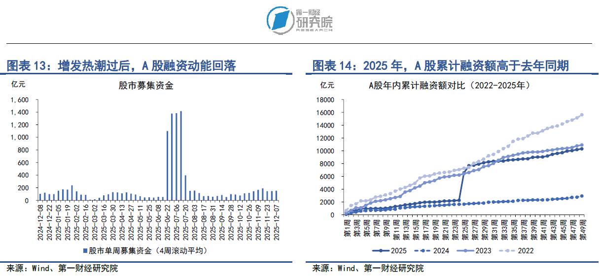 在12月1至12月5日当周,A股融资总额为128.39亿元,较前一周下降30.24亿元。年内,A股累计融资额超1.03万亿元,高于往年同期。值得注意的是,目前A股融资主要集中于增发和可转债,IPO融资额年内累计为1164.68亿元,占总融资的比重为11.3%。
