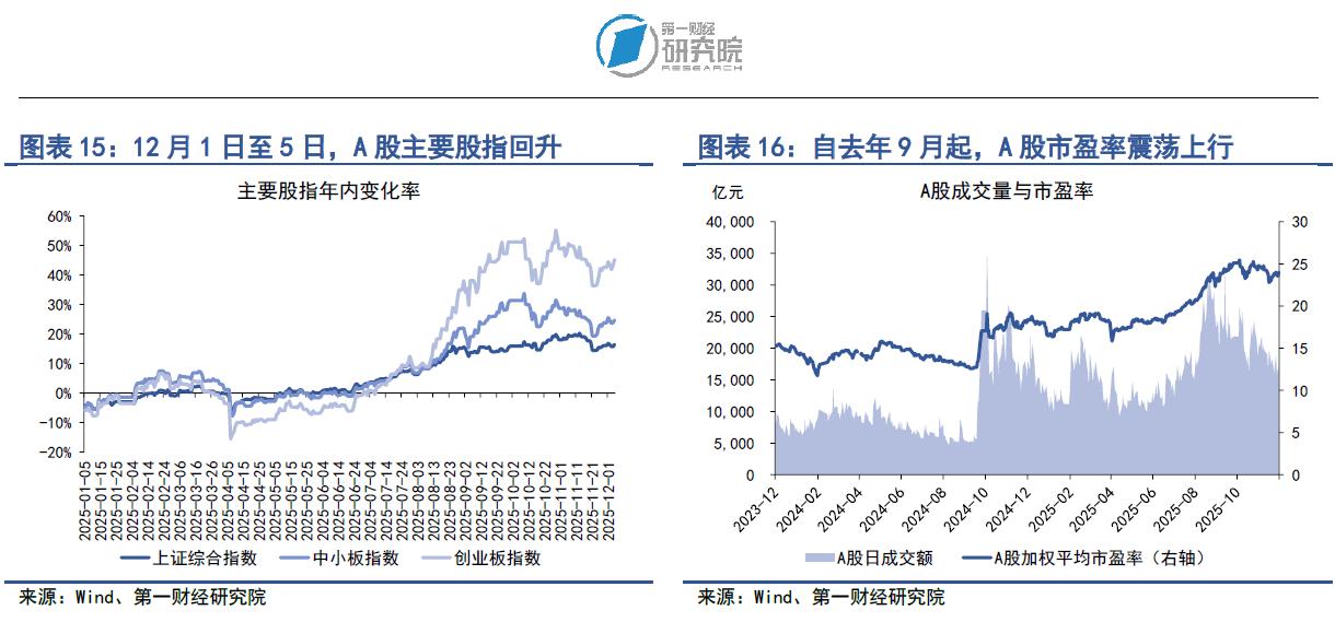 在12月1日至12月5日当周,A股主要股指回升,其中上证综指上升0.37%,中小板指上升0.78%,创业板指上升1.87%。年内,主要股指呈现震荡向上走势,上证综指累计上涨16.44%,中小板指累计上涨24.69%,创业板指数累计上涨45.19%。