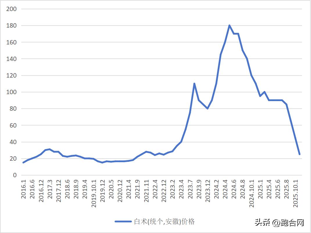 白术的大幅下跌主要源于产新集中与供应量大增。前期高价刺激药农大规模扩种,如今正值产新季,新货集中上市,市场供需严重失衡。