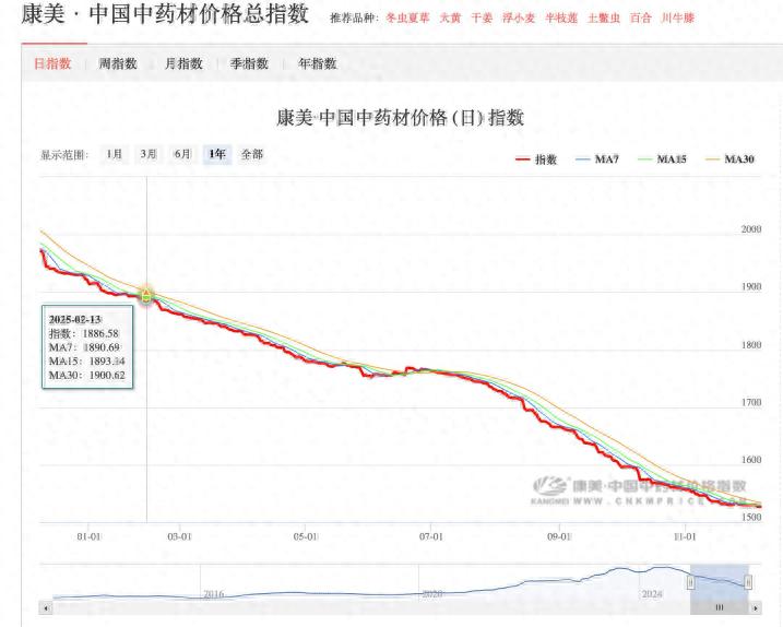 (人民日报健康客户端记者 谭琪欣)暴涨后又暴跌,中药材市场行情如坐“过山车”。截至12月8日,康美·中国中药材价格总指数已跌至1527.03点,较去年同期下跌444.06点,价格水平基本回落至2020-2021年间。另一关键指标“中药材综合200指数”也较2023年高点下挫近30%,跌势未见尽头。有市场分析指出,此轮“熊市”或将持续2年至3年。