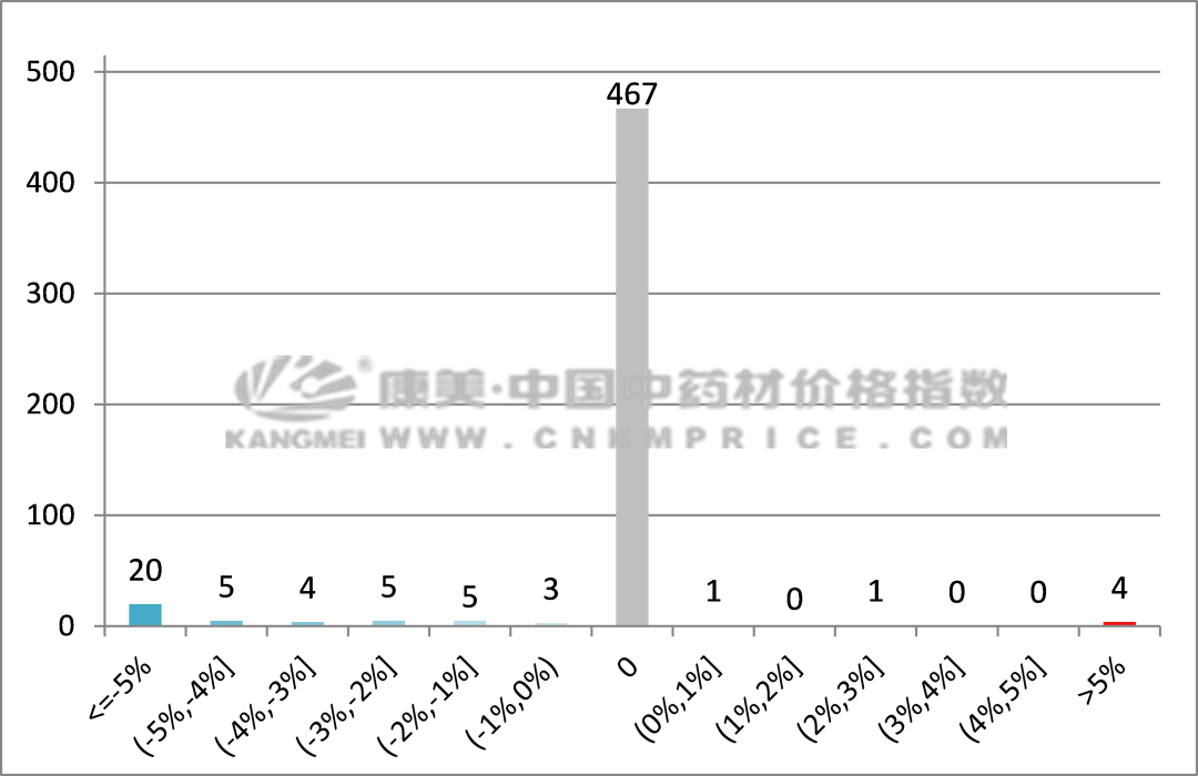 在价格变动的产品中,价格上涨稍大的品种包含玄参、桂圆肉、菊花、罗汉果、麦冬、三棱等;下跌幅度较大的品种有牛蒡子、公丁香、僵蚕、沙苑子、连翘、蝉蜕、路路通、百合等。
