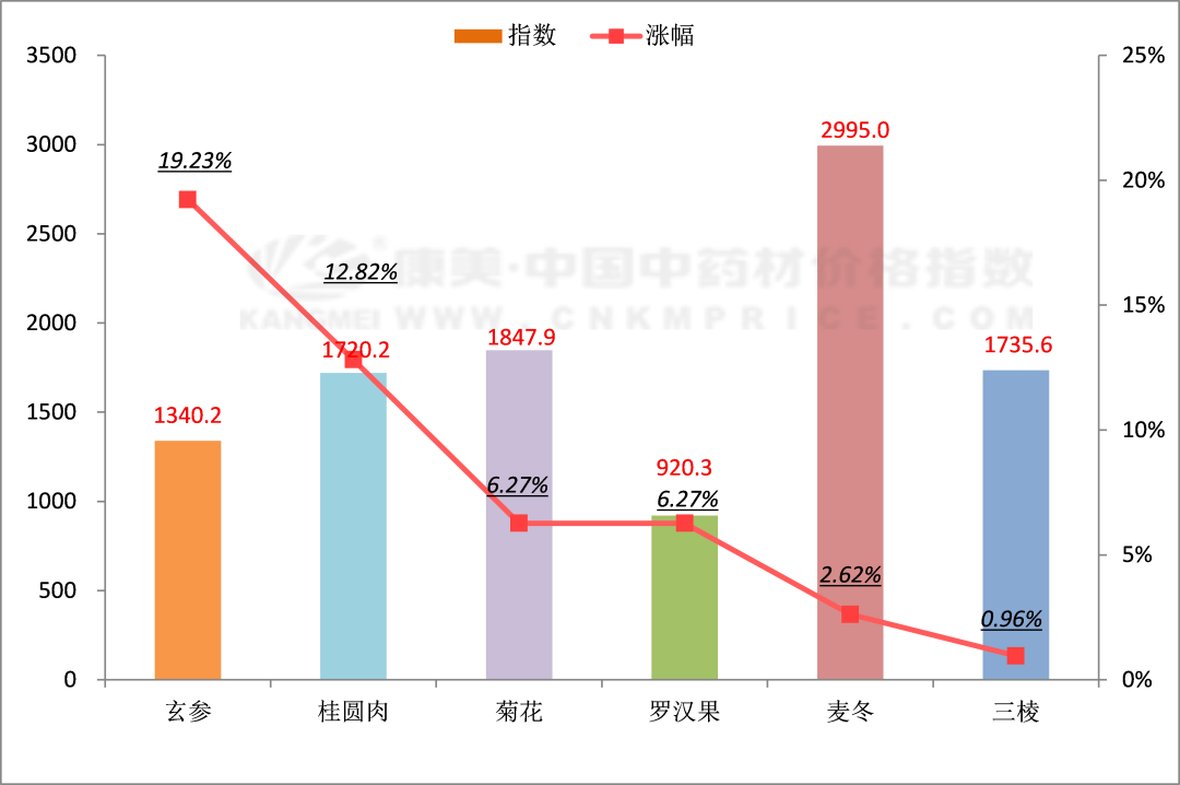 本期价格上涨稍大的品种有玄参、桂圆肉、菊花、罗汉果、麦冬、三棱等。