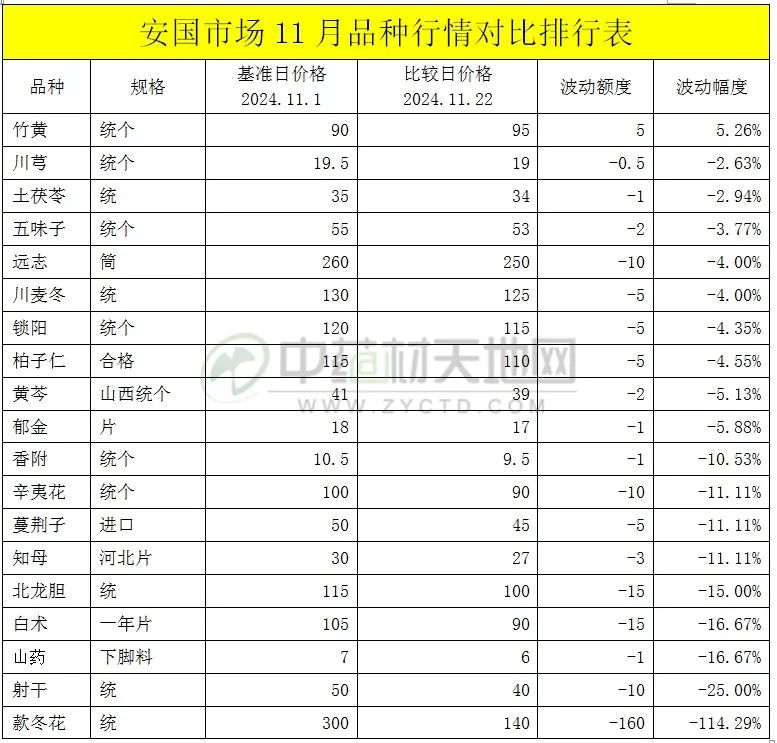 菟丝子新货上市后行情下滑;丹参、防风产新继续,价继续下调;天麻新货上市后,行情走疲;酸枣仁关注力度减弱,行情回落;西红花行情转稳;川芎、泽泻关注度减弱,价疲;款冬花新货产出有量,价自然回落;紫菀产新继续,价格跌幅明显;知母、射干行情较前期跌幅明显;苍术今年产量大,价疲;车前子行情继续下滑;调料品种以胡椒、草果、益智、白豆蔻为首,行情震荡;白芍、丹皮货源走销减缓 ,价疲;黄芩2-3年生的产出量不大,但需求不旺及一年生货量的冲击导致行情下滑;白茅根新货产出,价回落;郁金新货产量大,行情走低。