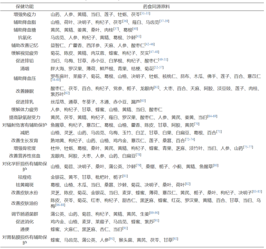 2.1.2 保健食品和功能  食品药食同源原料因具有特定的功效, 因此被广泛用于功能食品和保健食品的研究与开发。2002年《卫生部关于进一步规范保健食品原料管理的通知》第51号文件, 公布了87种物质目录, 后将槐米和槐花合并为一种, 调整至86种。2019年11月《关于当归等6种新增按照传统既是食品又是中药材的物质公告》第8号文件新增了6种。2019年12月国家卫生健康委、国家市场监管总局发布了《党参等9种试点按照传统既是食品又是中药材的物质名单》, 新增了9种。按以上文件,可用于功能食品和保健食品生产的药食同源原料共计101种。