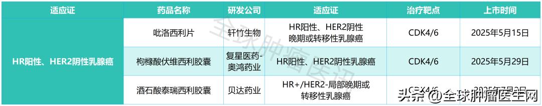 2025年5月15日,该药的上市申请获国家药品监督管理局(NMPA)批准,用于治疗成人HR阳性、HER2阴性的晚期或转移性乳腺癌。