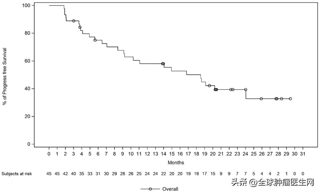 结果显示:27例患者达到部分缓解(PR),客观缓解率(ORR)为40.9%(95%Cl:29.0-53.7);12个月无进展生存(PFS)率为67.7%(95%Cl:29.0-53.7),12个月总生存(OS)率为95.9%(95%Cl:84.5-99.0)。