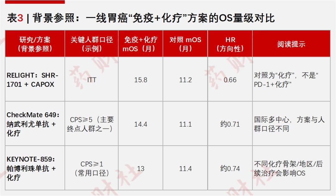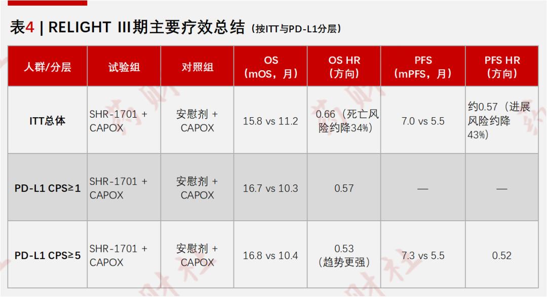 瑞拉芙普α则反其道而行,Ⅲ期 RELIGHT 研究采用“双抗+CAPOX 化疗”对阵“安慰剂+CAPOX 化疗”的设计,聚焦 HER2 阴性且 PD-L1 CPS≥1(CPS,联合阳性评分) 人群,既避免与成熟 PD-1 方案正面碰撞,又专门瞄准现有治疗获益有限、却理论上更可能从 TGF-β 调节中受益的“免疫敏感”患者,把成功概率尽量掌握在自己手里。