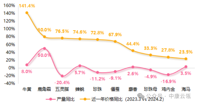 2、供给不足,资本借势炒作  如图5所示,近一年价格同比涨幅TOP10品种中,半数有不同程度的减产或供给不足;同时部分品种受资本炒作因素影响,以致价格上涨,如?;?、蝉蜕等。